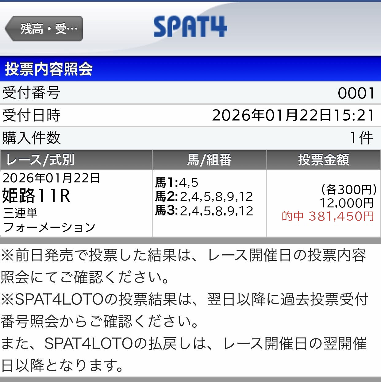1月の重賞は毎年、金杯からずっと荒れますね、競馬場ではゴール後に悲鳴でしょうが私は歓喜でした。 軸は前評判人気馬だったから個人の予想で買えても、2着、3着と11人気、9人気は絶対に拾えていなかったです。 気持ち的にはもっとオッズ上ってほしかったけど、50万9500円払い戻しは1月から上々のスタートです。 競馬予想サイト使うからにはこれくらいを毎回貰いたいところですね。
