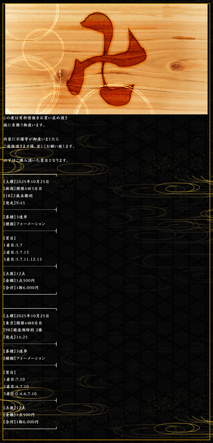 かれこれ3年以上にわたって麒麟を愛用しています。 これは日曜日の3連単536.7倍的中予想です。 土曜日には無料情報で12万9900円的中。 日曜日は有料情報で26万8350円的中。 無料情報も当たるけど有料情報の方がやっぱり配当額は上回ってきますね。 毎週感謝しかないです。