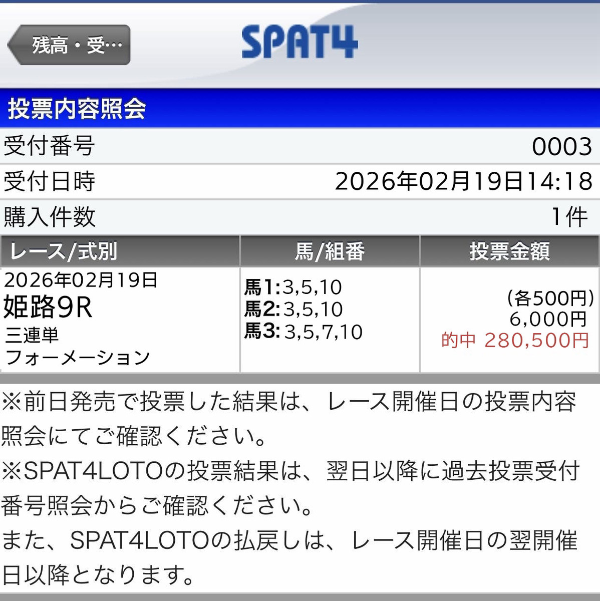 めっっっっちゃ荒れた愛知杯予想にのって取れました! アイサンサン、セフィロ、12番人気&13番人気なんて一般的常識の予想じゃ絶対相手に入れられない、こういう常識破壊の予想が一番欲しいのよ。 無理に3連単で取りにいかず3連複にシフトチェンジしたあたりもプロ予想家って感じだね。 3連単70万馬券なんて絶対取れないね、ウィン5も110人しか的中者いなかったし。3連複162,740円的中で×300円で48万8220円払い戻し! 9,300円の馬券代考えれば大勝といえるね!