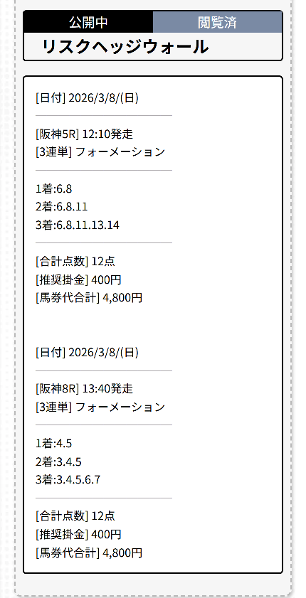 阪神競馬場、現地参戦が決まっていたので攻略情報をこしらえて競馬観戦。 重賞開催ではなかったのでそこまで人はいなかったです、そんな話より 2発2的中の結果で大満足! 阪神5→325,000円 阪神8→110,760円 1日で435,760円も稼げたのは人生初、めっちゃ的中するサイト見つけました