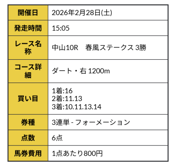 小倉大賞典予想的中ありがとうございました。 買い目画像もPAT画像もスクショ撮り忘れてしまったけど 711倍を3連単10点1点500円で的中 35万5500円、回収率も異常な数値… 先週知ったけど、平場も多めに予想出しているし、今週は先週以上に稼げそうな感じだな。